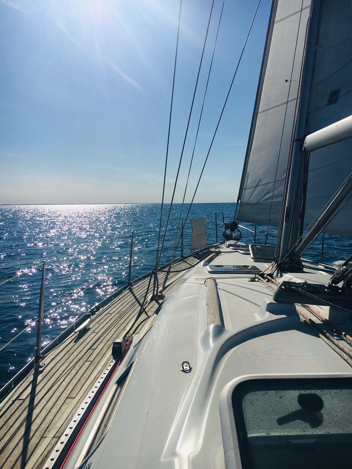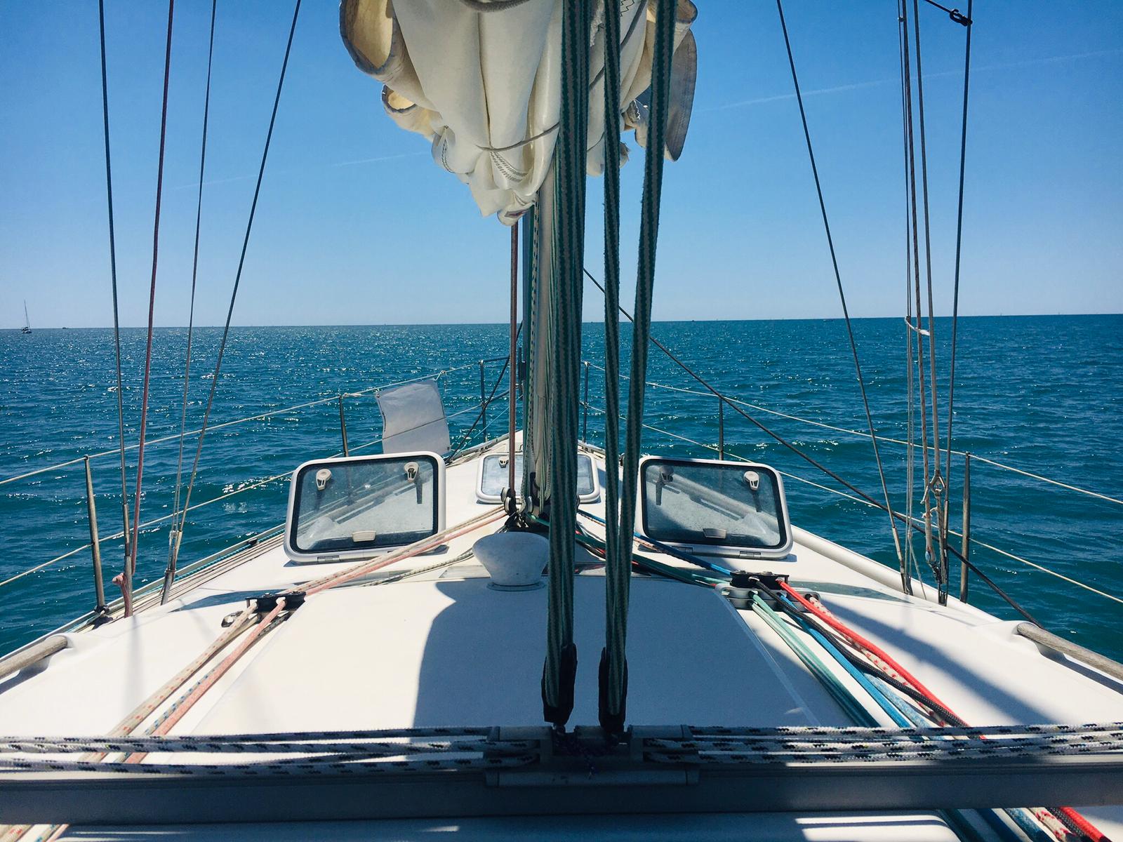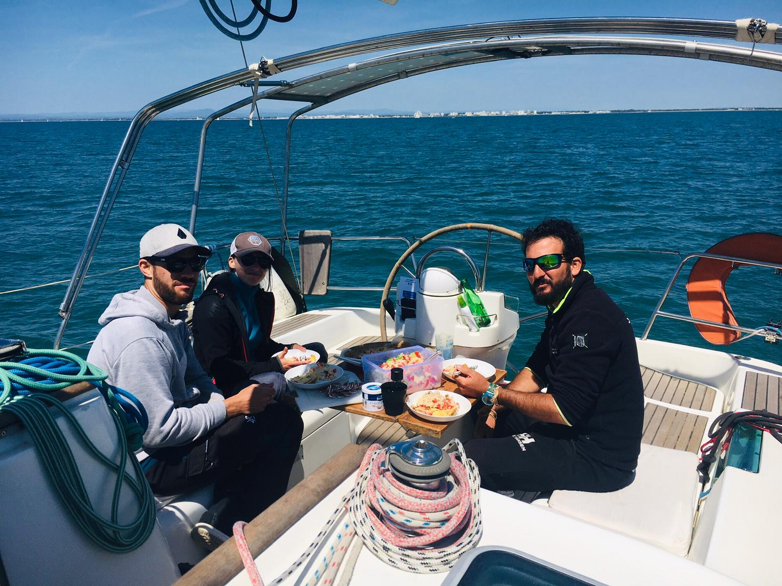 le 1er embarquée de 2021 aura était abrégé. En cause les conditions de vent et de mer difficiles du dimanche. Ça ne nous a pas empêché de nous retrouver vendredi soir pour organiser la sortie du samedi, qui elle, en contraste avec le lendemain, était annoncée estivale. Partis de bonne heure, le petit déjeuner est pris en Mer, le vent de secteur nord-est causait sans doute par le thermique nocturne nous permet de parcourir, dans la matinée, les 9 miles qui nous séparent de l’espiguette. Là nous posons l’encre, si ce n’est pour la baignade (dans de l’eau à 16°C ), au moins pour le repas du midi. Le « banc de sable », pris d’assaut nous poussent à nous décaler vers le sémaphore, où le mouillage et de bonne tenue, la profondeur faible mais régulière. Sur le retour, une régate (parcours côtier) en baie d’Aigues mortes nous fait réviser les règles de privilège. Le vent ayant tourné sud-est le retour se fait bâbord armure sur une allure portante. On est donc obligés de zigzaguer entre les concurrents remontants au près. Le samedi soir pour clôturer cette « longue » journée, une fois le bateau rangé, c’est l’heure du debrief de cette journée qui a semblé durer un an et une seconde.