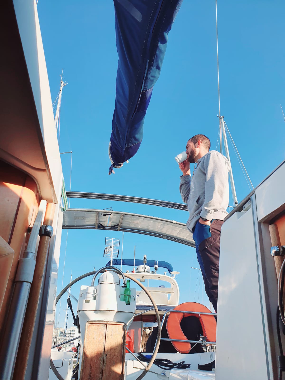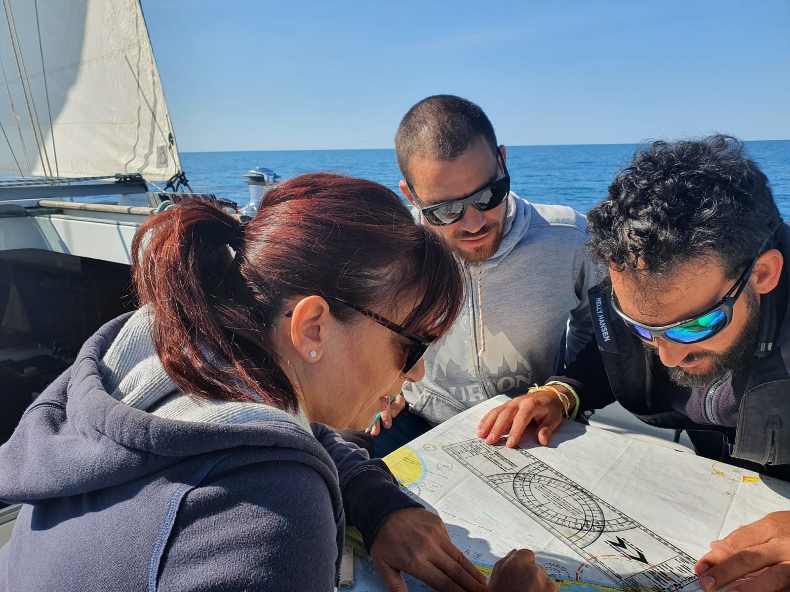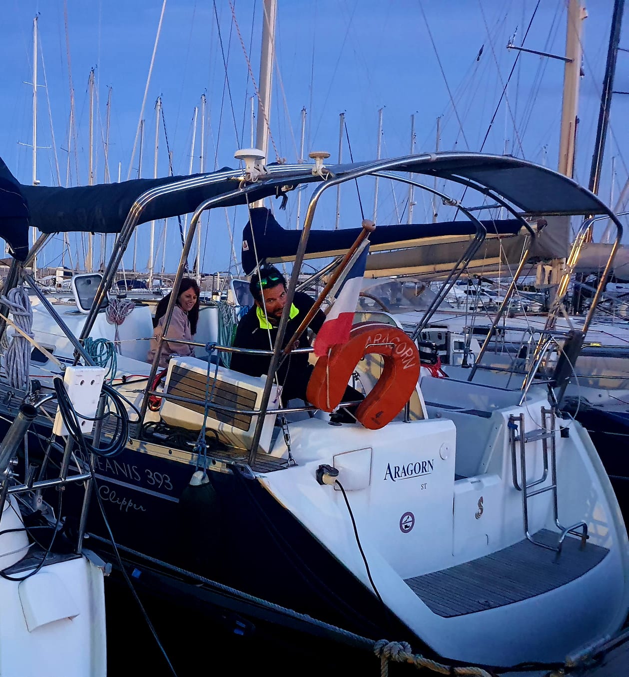 le 1er embarquée de 2021 aura était abrégé. En cause les conditions de vent et de mer difficiles du dimanche. Ça ne nous a pas empêché de nous retrouver vendredi soir pour organiser la sortie du samedi, qui elle, en contraste avec le lendemain, était annoncée estivale. Partis de bonne heure, le petit déjeuner est pris en Mer, le vent de secteur nord-est causait sans doute par le thermique nocturne nous permet de parcourir, dans la matinée, les 9 miles qui nous séparent de l’espiguette. Là nous posons l’encre, si ce n’est pour la baignade (dans de l’eau à 16°C ), au moins pour le repas du midi. Le « banc de sable », pris d’assaut nous poussent à nous décaler vers le sémaphore, où le mouillage et de bonne tenue, la profondeur faible mais régulière. Sur le retour, une régate (parcours côtier) en baie d’Aigues mortes nous fait réviser les règles de privilège. Le vent ayant tourné sud-est le retour se fait bâbord armure sur une allure portante. On est donc obligés de zigzaguer entre les concurrents remontants au près. Le samedi soir pour clôturer cette « longue » journée, une fois le bateau rangé, c’est l’heure du debrief de cette journée qui a semblé durer un an et une seconde.
