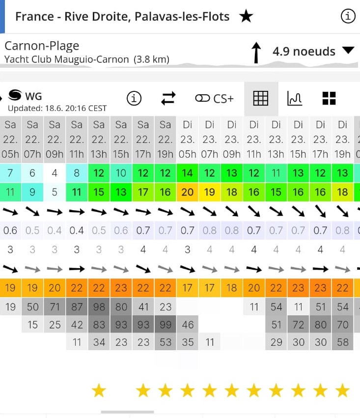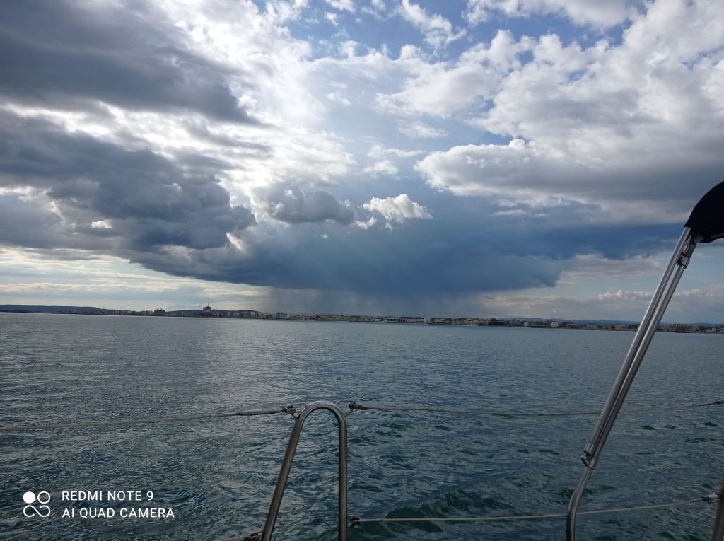 Hier, nous avons eu droit à un spectacle magnifique dans la baie d’Aigues mortes, des grains nous ont offert une lumières et des couleurs splendides et un vent, irrégulier mais présent.